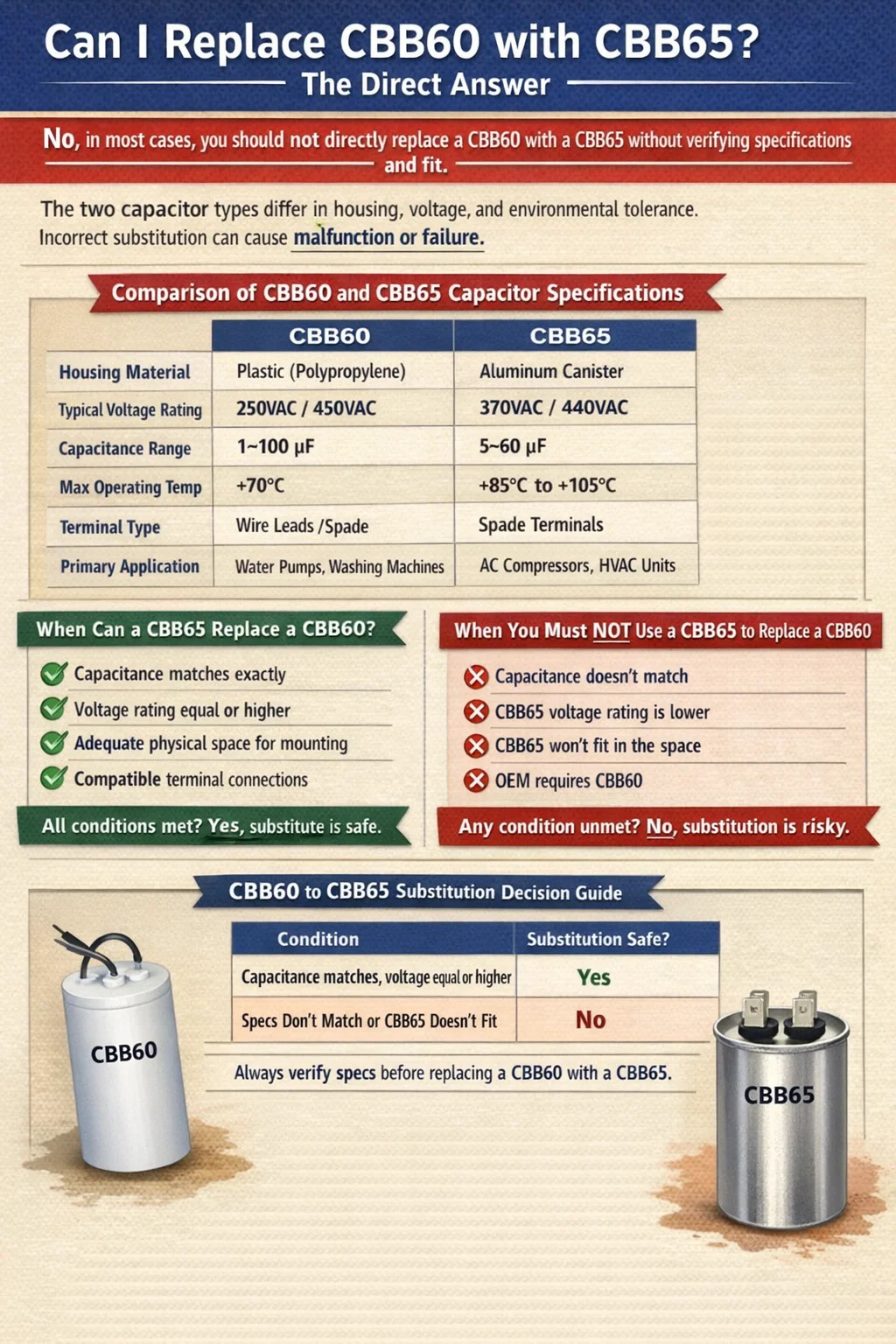 ดังที่กล่าวไว้ มีสถานการณ์เฉพาะที่สามารถใช้ CBB65 ทดแทน CBB60 ได้ โดยมีเงื่อนไขว่าค่าความจุไฟฟ้า อัตราแรงดันไฟฟ้า และการกำหนดค่าขั้วต่อจะเข้ากันได้ บทความนี้จะอธิบายทุกสิ่งที่คุณจำเป็นต้องรู้ก่อนทำการแลกเปลี่ยน