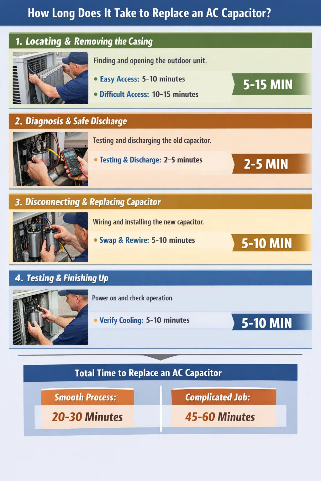ใช้เวลานานแค่ไหนในการเปลี่ยนจริง ตัวเก็บประจุเอซี ? หากคุณดูเพียงไม่กี่นาทีที่ช่างเทคนิคกำลังทำงาน คุณอาจคิดว่างานนั้นรวดเร็วอย่างน่าประหลาดใจ แต่ตั้งแต่ช่างมาถึงจนแอร์เป่าลมเย็นอีกแล้ว ก็มี กระบวนการที่เกี่ยวข้องทั้งสิ้น