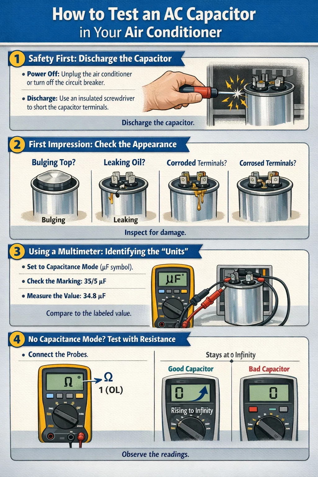 การพิจารณาว่าตัวเก็บประจุ AC ในเครื่องปรับอากาศดีหรือไม่ดีไม่จำเป็นต้องมีความรู้ด้านวิศวกรรมอิเล็กทรอนิกส์ระดับมืออาชีพ ตราบใดที่คุณมีมัลติมิเตอร์ที่มีฟังก์ชัน "การทดสอบความจุ" คุณสามารถทำตามขั้นตอนเหล่านี้และกลายเป็นกึ่งผู้เชี่ยวชาญได้ด้วยตัวเอง