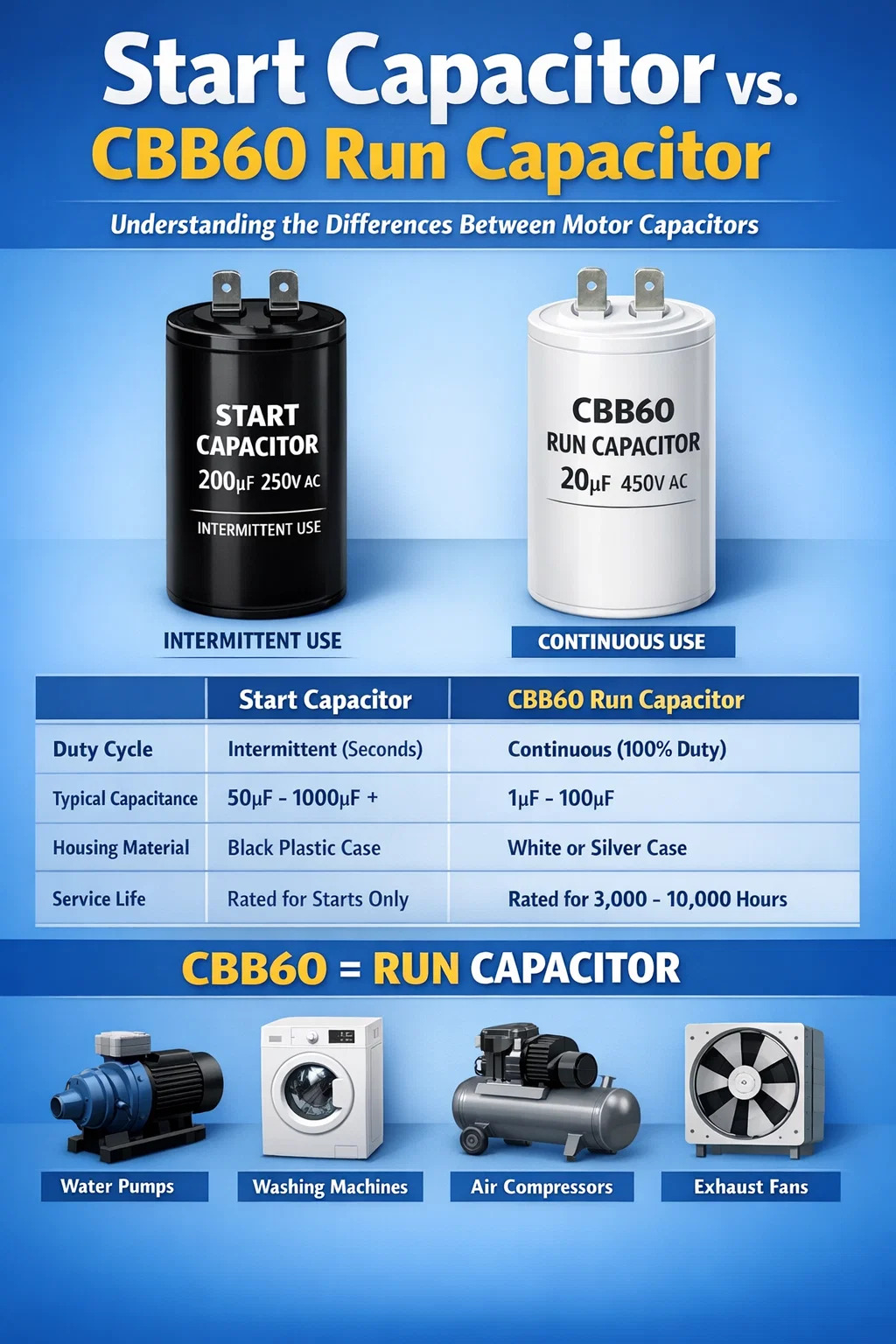เพราะว่า ตัวเก็บประจุ CBB60 ถูกสร้างขึ้นเพื่อการวิ่งต่อเนื่อง โดยพบในเครื่องใช้ไฟฟ้าที่ต้องการแรงหมุนที่สม่ำเสมอและมีประสิทธิภาพ เหล่านี้เป็นเครื่องจักรที่มอเตอร์อาจทำงานครั้งละหลายชั่วโมง เช่น: