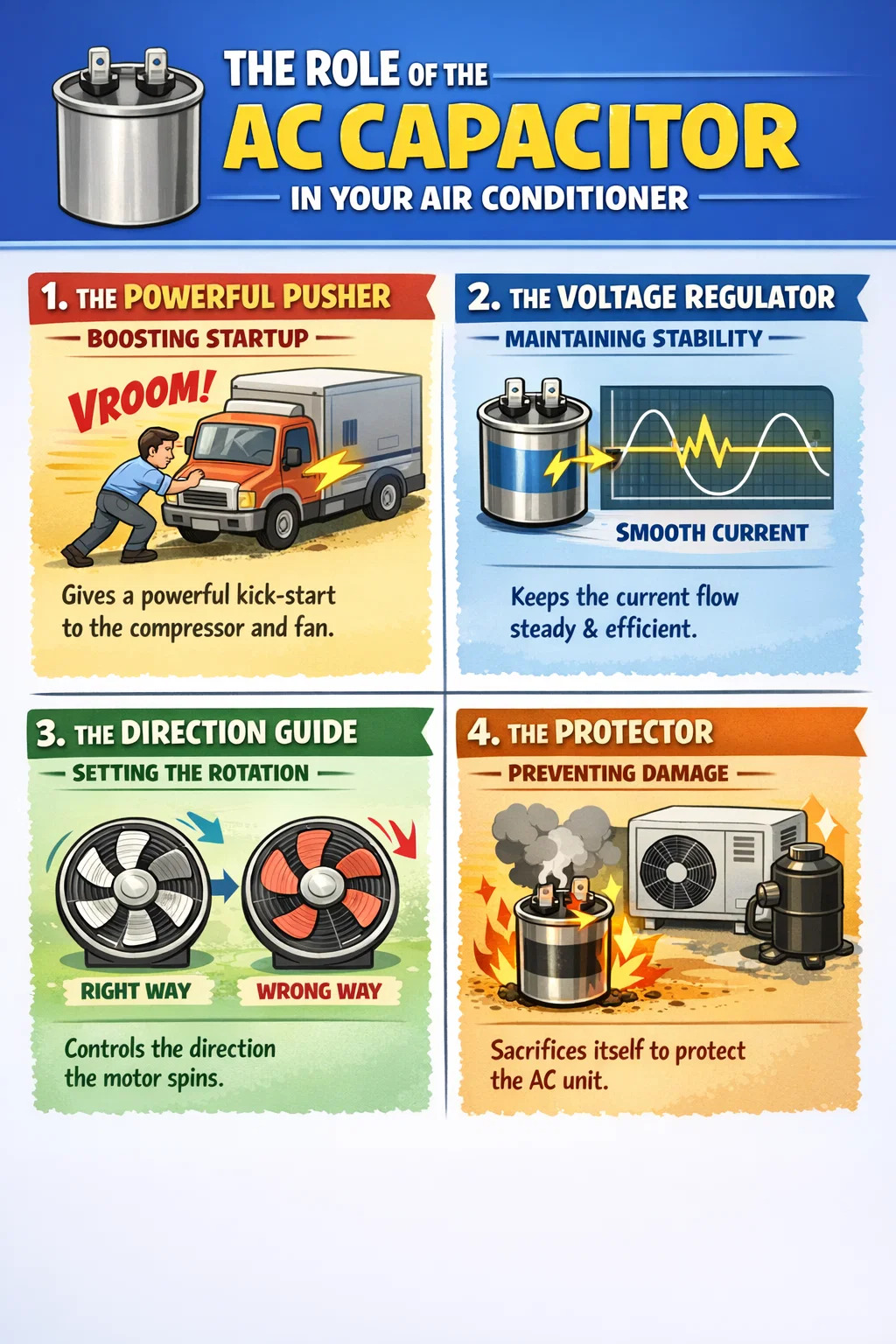 การเสียสละตัวเองเพื่อปกป้องชิ้นส่วนที่มีราคาแพง: เมื่อเทียบกับคอมเพรสเซอร์ซึ่งมีราคาหลายพันหยวน ตัวเก็บประจุแบบ AC ถือเป็นชิ้นส่วนที่มีราคาไม่แพงนัก ด้วยการ "ดูดซับ" และ "ปล่อย" พลังงานไฟฟ้า จึงช่วยลดแรงกดดันต่อมอเตอร์ บ่อยครั้ง เมื่อเครื่องปรับอากาศไม่เย็นในฤดูร้อน สาเหตุมาจากตัวเก็บประจุ "เข้าโจมตี" คอมเพรสเซอร์และไฟไหม้เสียก่อน