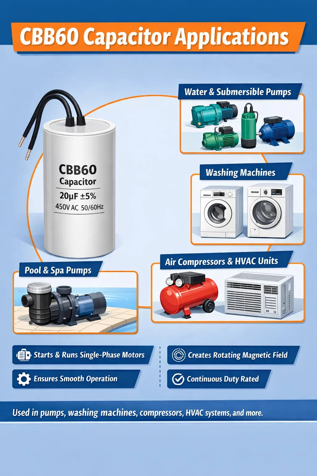 เครื่องอัดอากาศแบบเฟสเดียวที่ใช้ในโรงงานและช่องบริการด้านยานยนต์มักต้องการหน่วย CBB60 ที่มีความจุสูง — ค่าของ 50 µF ถึง 100 µF เป็นเรื่องปกติในมอเตอร์คอมเพรสเซอร์ขนาด 1.5 kW ถึง 3 kW มอเตอร์พัดลม HVAC และคอมเพรสเซอร์ขนาดเล็กในเครื่องปรับอากาศแบบหน้าต่างบางรุ่นยังใช้ตัวเก็บประจุแบบ CBB60 อีกด้วย แม้ว่าในตลาดอเมริกาเหนือ รูปแบบกระป๋องอะลูมิเนียมรูปไข่จะแพร่หลายมากกว่า ในขณะที่รูปทรง CBB60 ทรงกระบอกจะครองเอเชียและส่วนใหญ่ของยุโรป