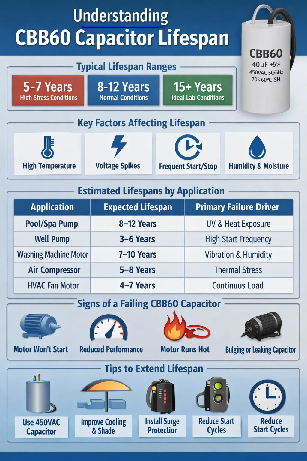 อายุการใช้งานของตัวเก็บประจุ CBB60 โดยทั่วไปจะอยู่ในช่วงตั้งแต่ 8 ถึง 12 ปี ภายใต้สภาวะการทำงานปกติ แม้ว่าหลายยูนิตจะล้มเหลวเร็วกว่าปกติ (มักจะเกิดขึ้นภายใน 5 ถึง 7 ปี) เมื่อต้องเผชิญกับความเครียดจากความร้อน แรงดันไฟฟ้าพุ่งสูง หรือการหมุนเวียนโหลดสูงอย่างต่อเนื่อง ในสภาวะห้องปฏิบัติการที่เหมาะสม โดยมีการควบคุมอุณหภูมิและแรงดันไฟฟ้า ตัวเก็บประจุแบบรัน CBB60 บางตัวมีอายุการใช้งานเกิน 15 ปี อย่างไรก็ตาม สภาพแวดล้อมการติดตั้งในโลกแห่งความเป็นจริงไม่ค่อยตรงตามพารามิเตอร์ในอุดมคติเหล่านี้